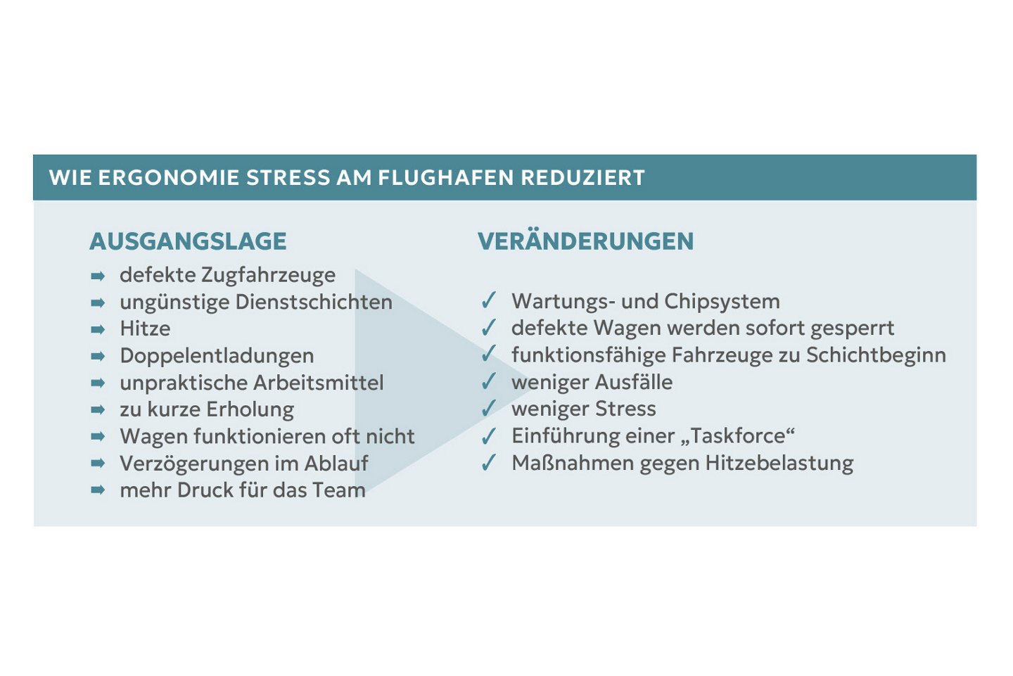 Was Ergonomie konkret leisten kann, zeigt Domburg am Beispiel des Wiener Flughafens. Ausgangspunkt war ein gemeinsames Projekt zur Arbeitsfähigkeit in der Abfertigung. In Coachings und Interviews mit rund 40 Beschäftigten, darunter Catering-Mitarbeiter:innen, Busfahrer:innen, Pushback-Fahrer, Be- und Entlader:innen, wurden zentrale Belastungen sichtbar: defekte Zugfahrzeuge, ungünstige Schichten, Hitze, zu kurze Regenerationszeiten und unpraktische Arbeitsmittel. Zu den großen Stressfaktoren gehörten Wagen, die zu Einsatzbeginn nicht immer funktionierten. Die Folgen: Verzögerungen und mehr Druck. Abhilfe schafft nun ein eigenes Wartungs- und Chipsystem: Defekte Wagen werden sofort gesperrt, Ausfälle und Stress reduziert.