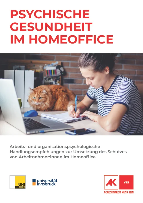 Psychische Gesundheit im HomeofficeDie Broschüre „Psychische Gesundheit im Homeoffice“ identifiziert spezifische psychische Gefahren, die bei Homeoffice auftreten können und auch im Zuge der Evaluierung psychischer Belastungen laut ArbeitnehmerInnenschutzgesetz zu berücksichtigen sind. Stand: April 2022 -